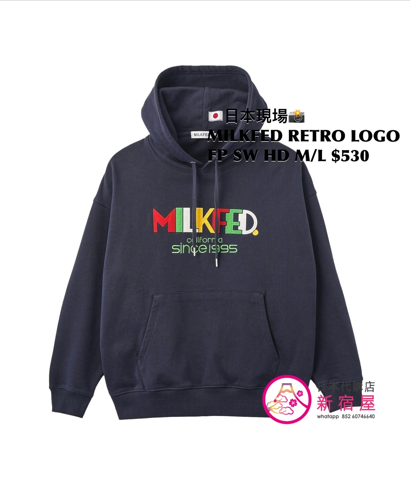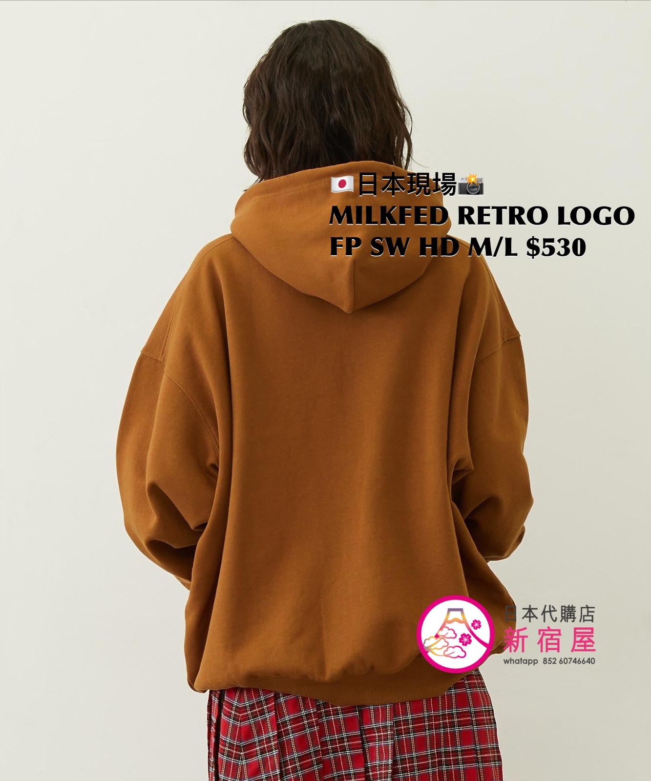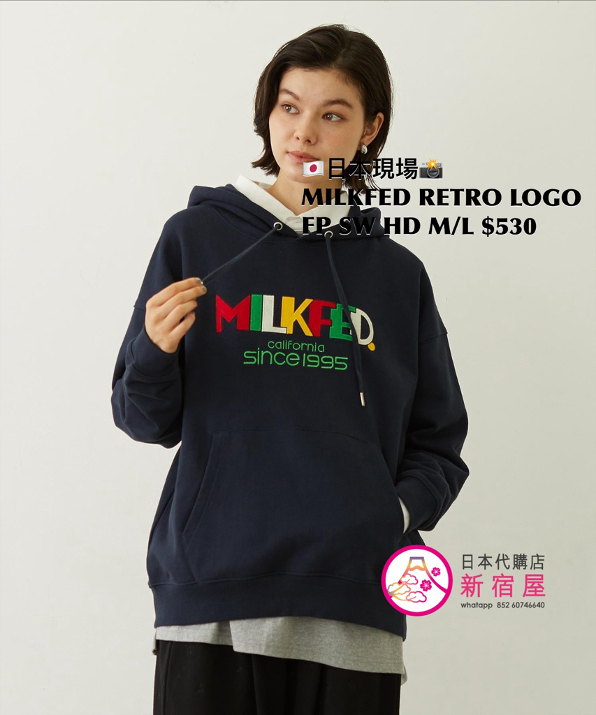 MILKFED RETRO LOGO FELT PATCH SWEAT HOODIE SIZE M/L,NAVY/ OFF WHITE/ BROWN,$530 👚參考尺寸 SIZE M: 身幅 66 著丈 62cm SIZE L: 身幅 74 著丈 68cm
